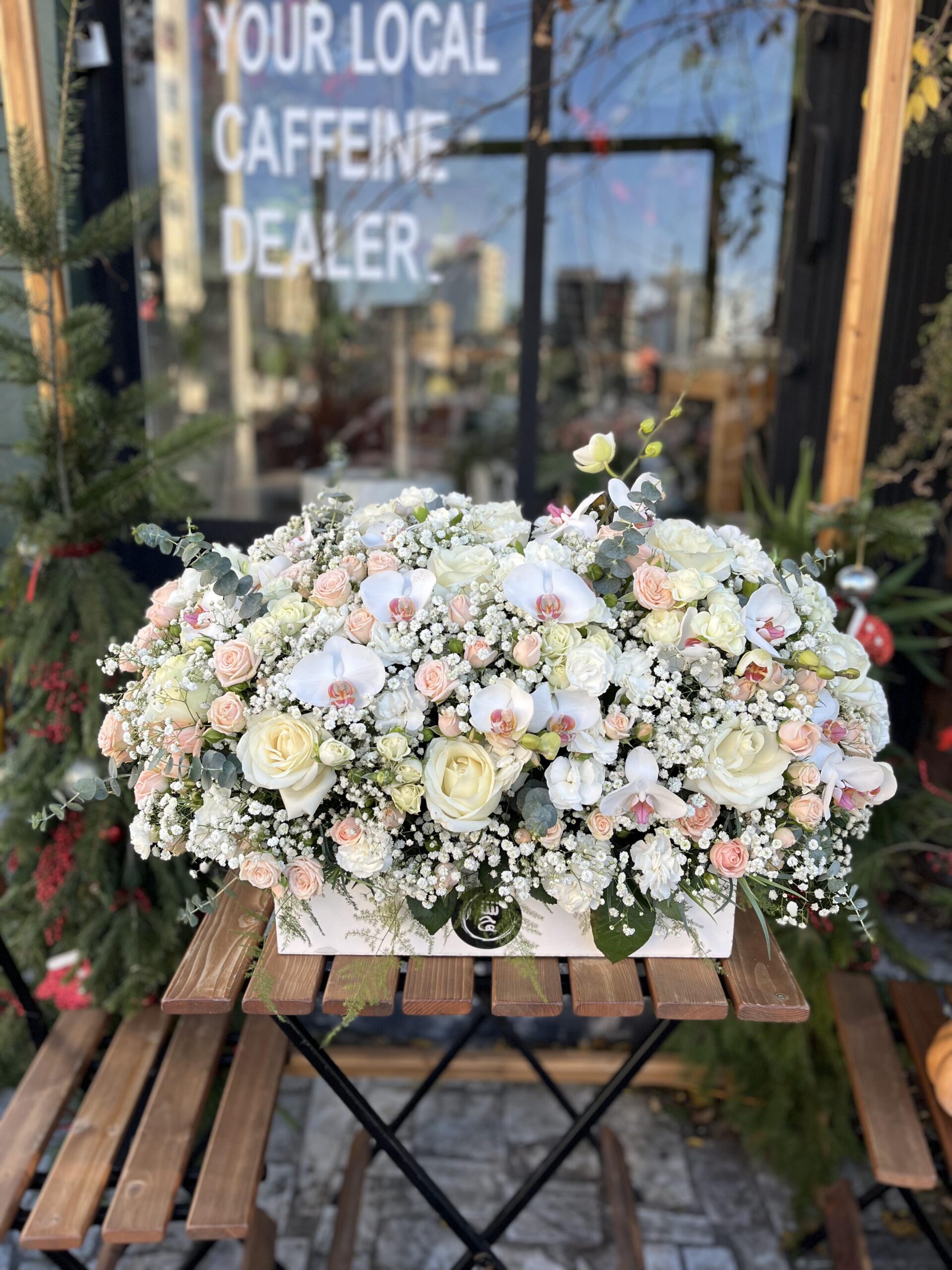 Çiçek Yaprağı Sırrı: Bu ahşap çiçek kutusu, beyaz gül, şeftali minyatür gülü, ganni, gypsophila ve beyaz orkidenin zarif birleşimidir. Beyaz gül saflığı ve sevgiyi simgelerken, şeftali minyatür gülü zarif bir dokunuş sunar. Ganni çiçekleri egzotik bir hava yaratır, gypsophila ise sadelik ve zarafet katmaktadır. Beyaz orkide ise şıklık ekler.